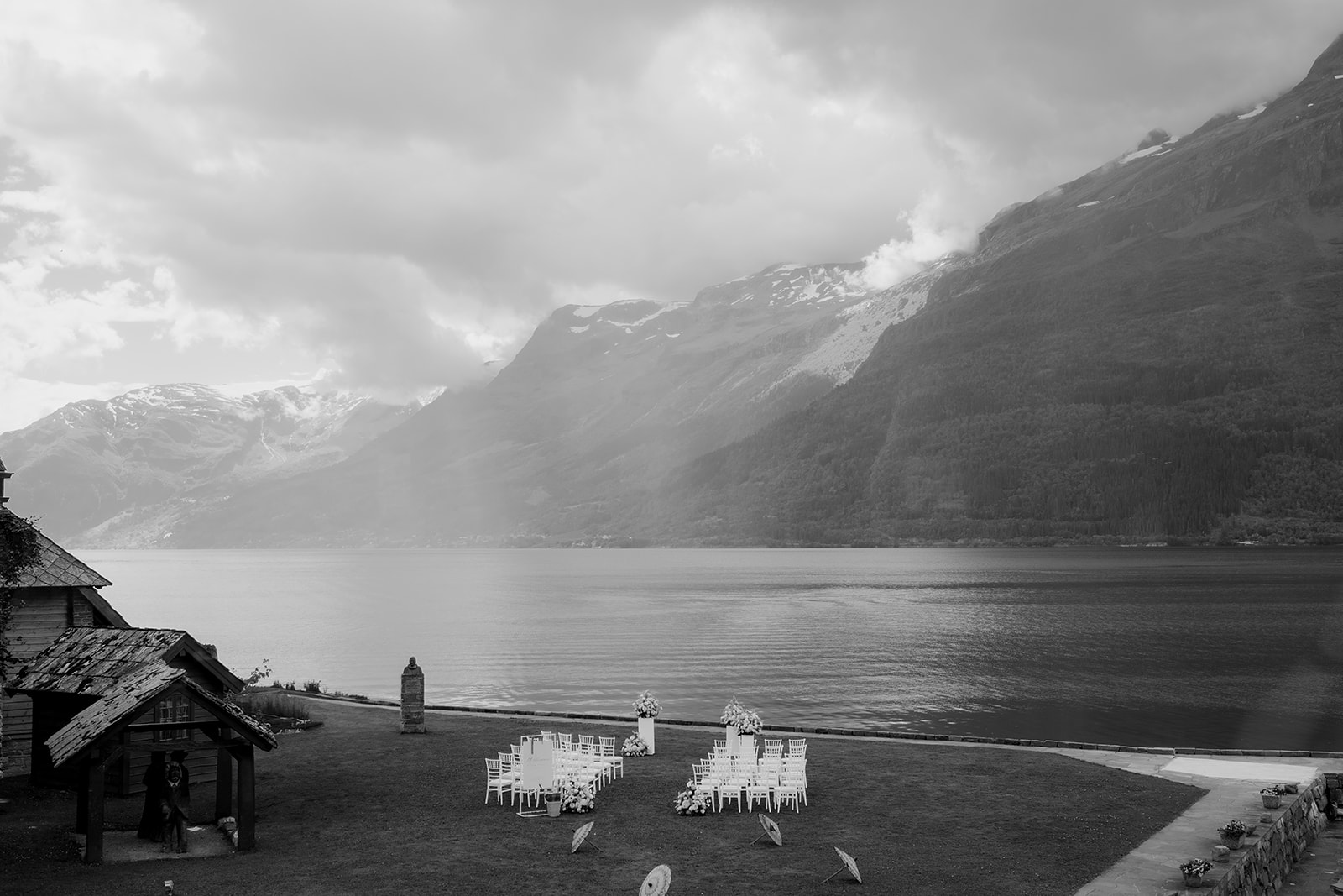 The hotel garden runs from the main building down to the water. It is the most common location for civil ceremonies. The aisle leads toward the fjord, with mountains framing the couple from behind. Garden ceremonies are part of the hotel’s wedding package and are managed end to end by the on-site wedding coordinator.
