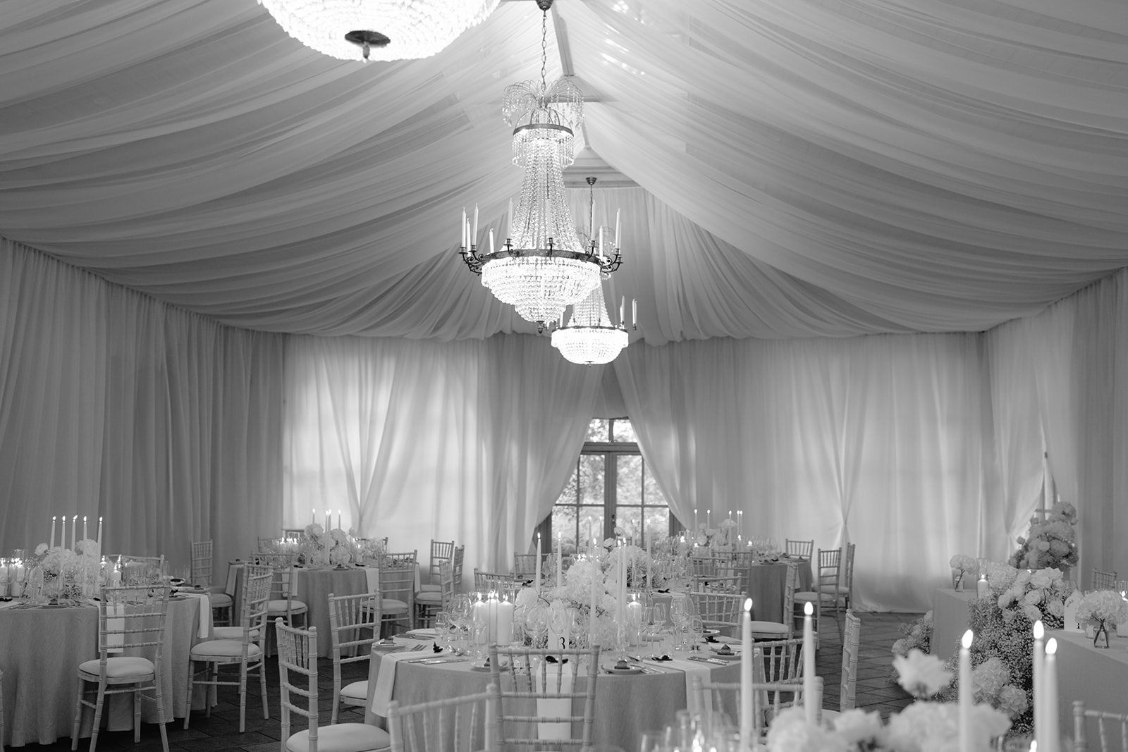 The Orangery provides a lighter, airier setting for ceremonies or cocktail hours. Its glass walls mean the space reads as part of the garden even when guests are inside, which works well for summer weddings where the light lingers past 10 PM.
